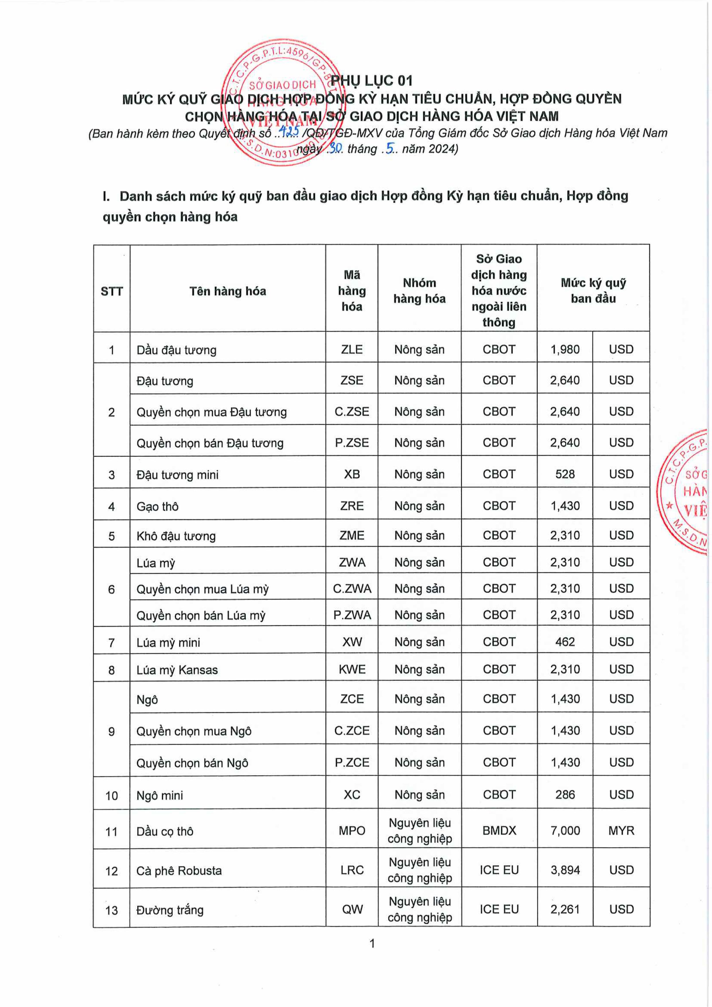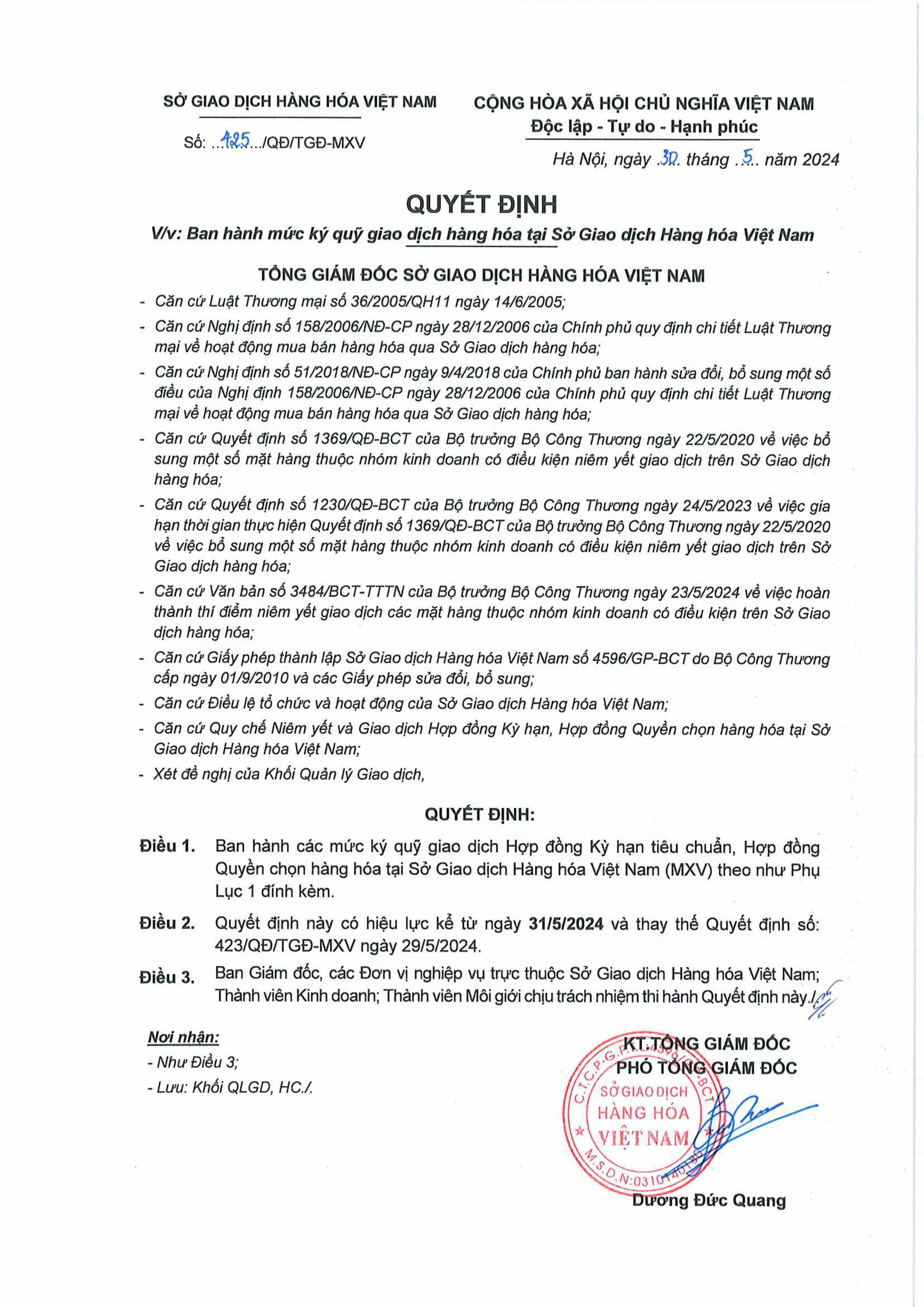 Căn cứ theo thông báo của Sở Giao dịch Hàng hóa Việt Nam, Công ty Cổ phần Hitech Finance gửi đến Quý Khách hàng Quyết định số: 434/QĐ/TGĐ-MXV Ngày 31/05/2024 Vv Ban hành mức ký quỹ giao dịch hàng hóa tại MXV.